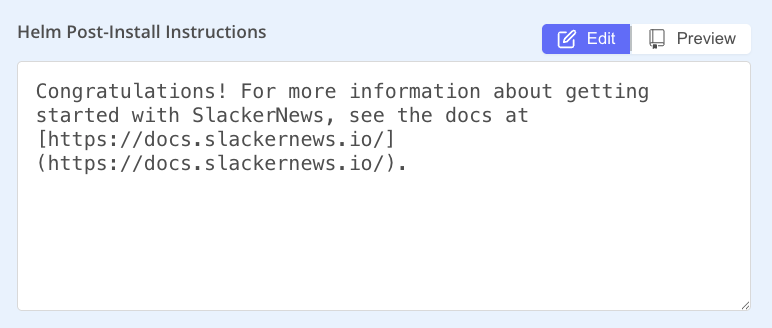 Go to the Knowledge base tab. For Helm Post-Install Instructions, enter the following markdown: